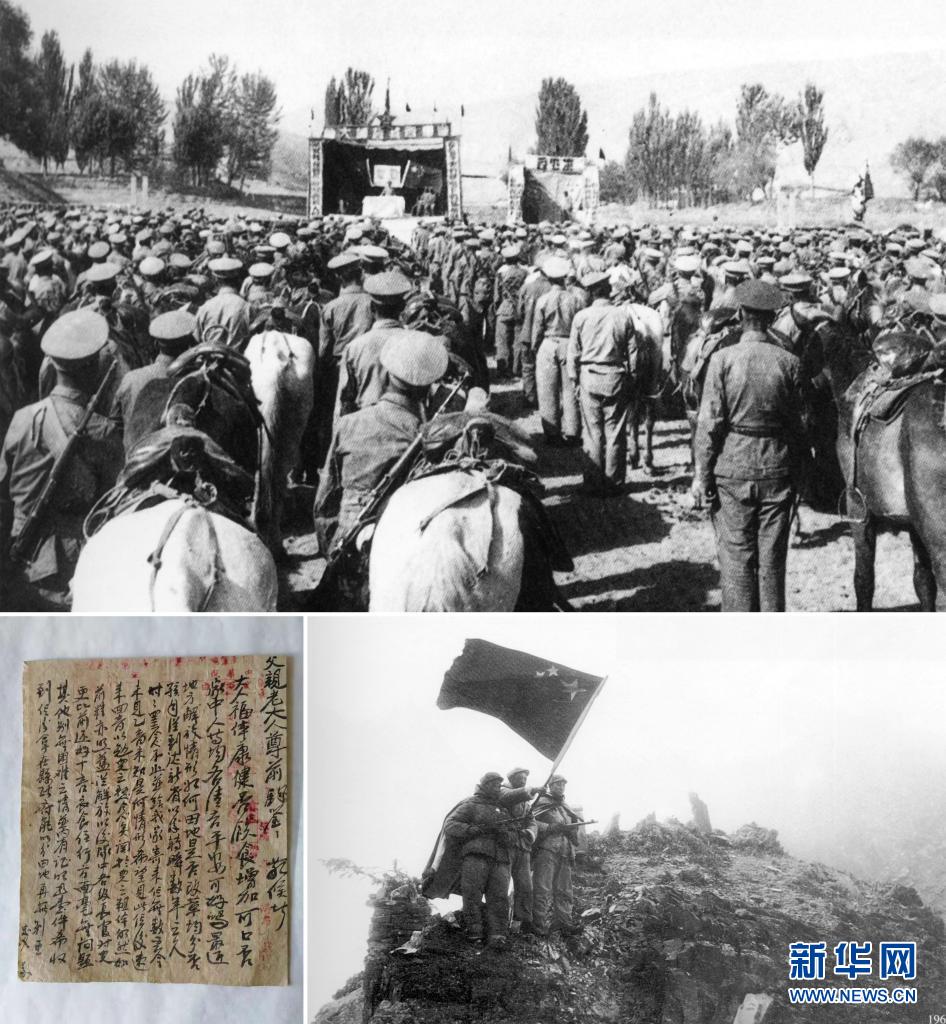 這是一張拼版照片,上圖為:1950年8月1日,獨(dú)立騎兵師一團(tuán)在新疆于田縣普魯村召開進(jìn)藏誓師大會(資料照片,進(jìn)藏英雄先遣連紀(jì)念館供圖);左下圖為:先遣連烈士陳忠義的家書(受訪者供圖);右下圖為:1951年,阿里和平解放(資料照片,進(jìn)藏英雄先遣連紀(jì)念館供圖)。新華社發(fā)