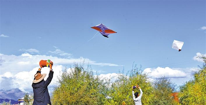 每年金秋時(shí)節(jié),在拉薩城的上空,便會(huì)出現(xiàn)千百只風(fēng)箏漫天飛舞、爭奇斗艷的景觀。在碧藍(lán)的天空下,那些形狀各異、如鷹似燕的風(fēng)箏,時(shí)而高飛、時(shí)而低落、時(shí)而旋轉(zhuǎn)、時(shí)而打斗,一旁觀戰(zhàn)或正在放風(fēng)箏的人仰頭觀看,歡呼聲、嘆息聲、助威聲此起彼伏,很是熱鬧。
