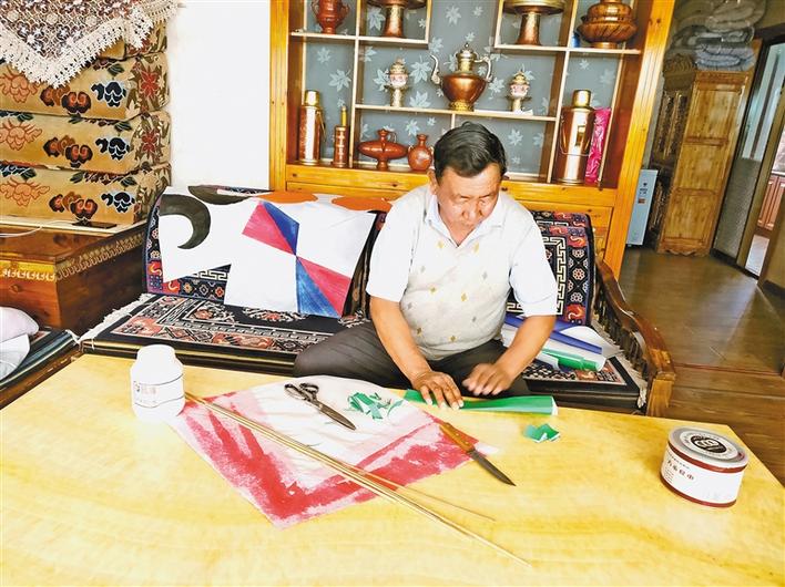 圖為拉薩風(fēng)箏制作技藝自治區(qū)級代表性傳承人普窮在家制作風(fēng)箏。