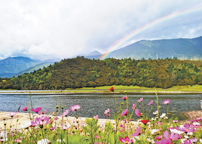 牧民騎馬穿行在花海中,遠(yuǎn)處的高山在繚繞的云霧中若隱若現(xiàn),炊煙裊裊,清風(fēng)送來田間青稞的香氣。