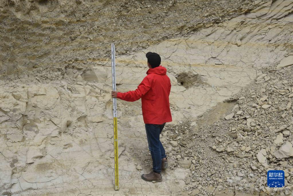 8月27日,在西藏日喀則市定結(jié)縣一處山體,科考隊(duì)員郭劍使用標(biāo)尺,測量湖相沉積物厚度。新華社記者 杜剛 攝