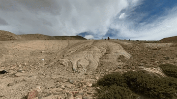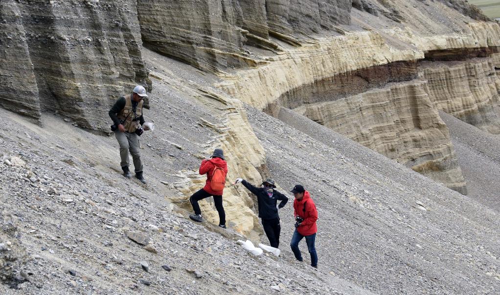 8月27日,科考隊(duì)員王昊(左)等人在西藏日喀則市定結(jié)縣區(qū)域內(nèi)考察一個(gè)垂直地面的沉積剖面。隊(duì)員們根據(jù)傾斜層理判斷,數(shù)萬年前這里是一個(gè)巨大的堰塞湖。新華社記者杜剛 攝