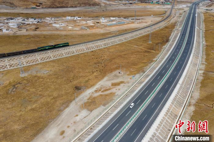 圖為一列進藏火車經過G6京藏高速西藏羊八井路段?!〗w波 攝