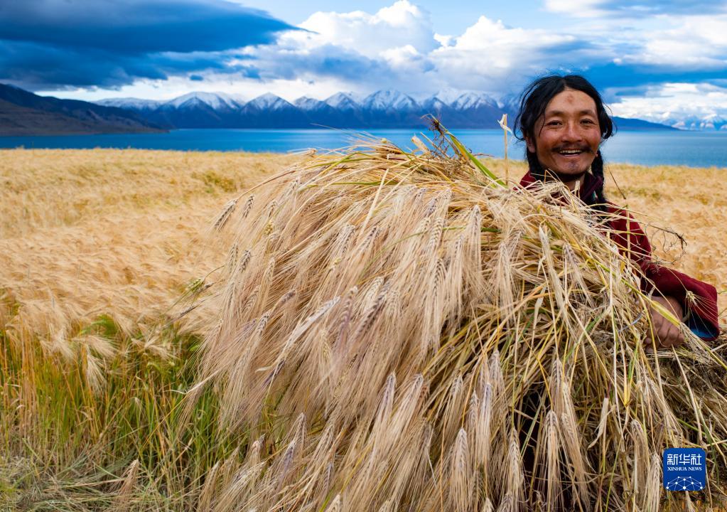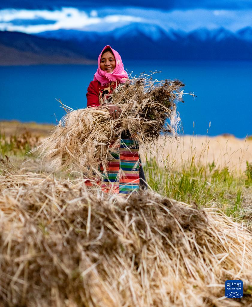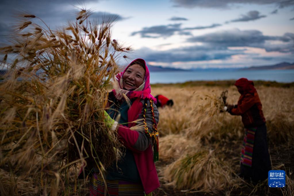 當日,西藏那曲市尼瑪縣文部鄉(xiāng)文部南村村民開鐮收割農(nóng)田里的青稞。文部鄉(xiāng)文部南村位于當惹雍措湖畔,海拔4645米,這里的村民以“薩馬卓”(半農(nóng)半牧之意)為主,在藏北高原獨具特色。