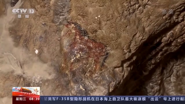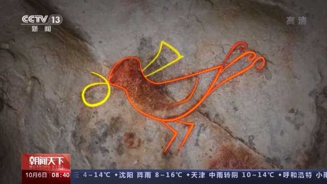 總臺記者 陳琴:現(xiàn)在我們就來到納木錯環(huán)湖科考巖畫調查點的1號點,您看到這個巖畫是由紅色的赭石這個顏料做成的,看起來特別像一只可愛的小鳥。