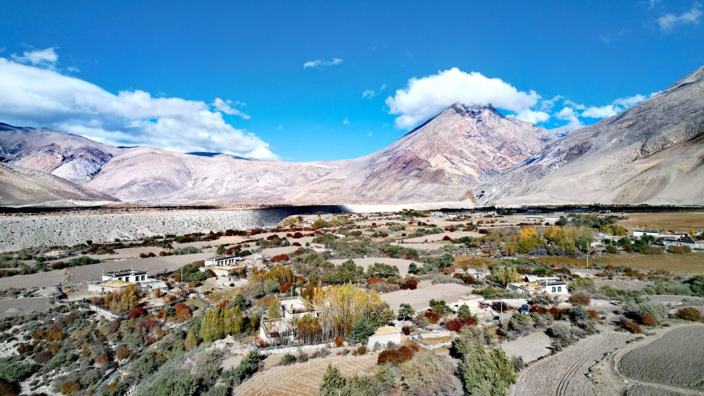 十月下旬,記者驅(qū)車來到曲當(dāng)鄉(xiāng)參木達(dá)村。透過航拍中的無人機(jī)遙控器顯示屏,記者看到,藏式民居在秋色浸染的樹木映襯下錯(cuò)落有致,秋日照耀下色彩斑斕,村東有巍峨的雪山、村西是奔騰南去的河流。