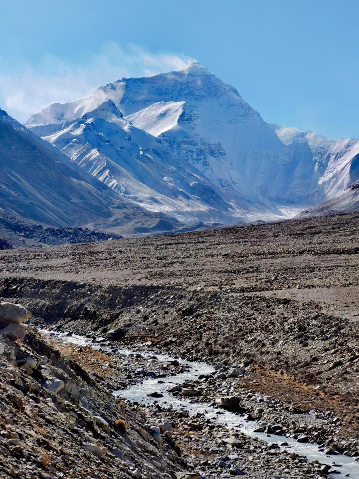 車行約20分鐘后,到達(dá)游客大本營。這里是游客在珠穆朗瑪峰國家級自然保護(hù)區(qū)內(nèi)可以到達(dá)的距離珠峰最近的位置。面向海拔8848.86米的珠峰,發(fā)源于絨布冰川末端的扎嘎曲在游客大本營右邊流過。