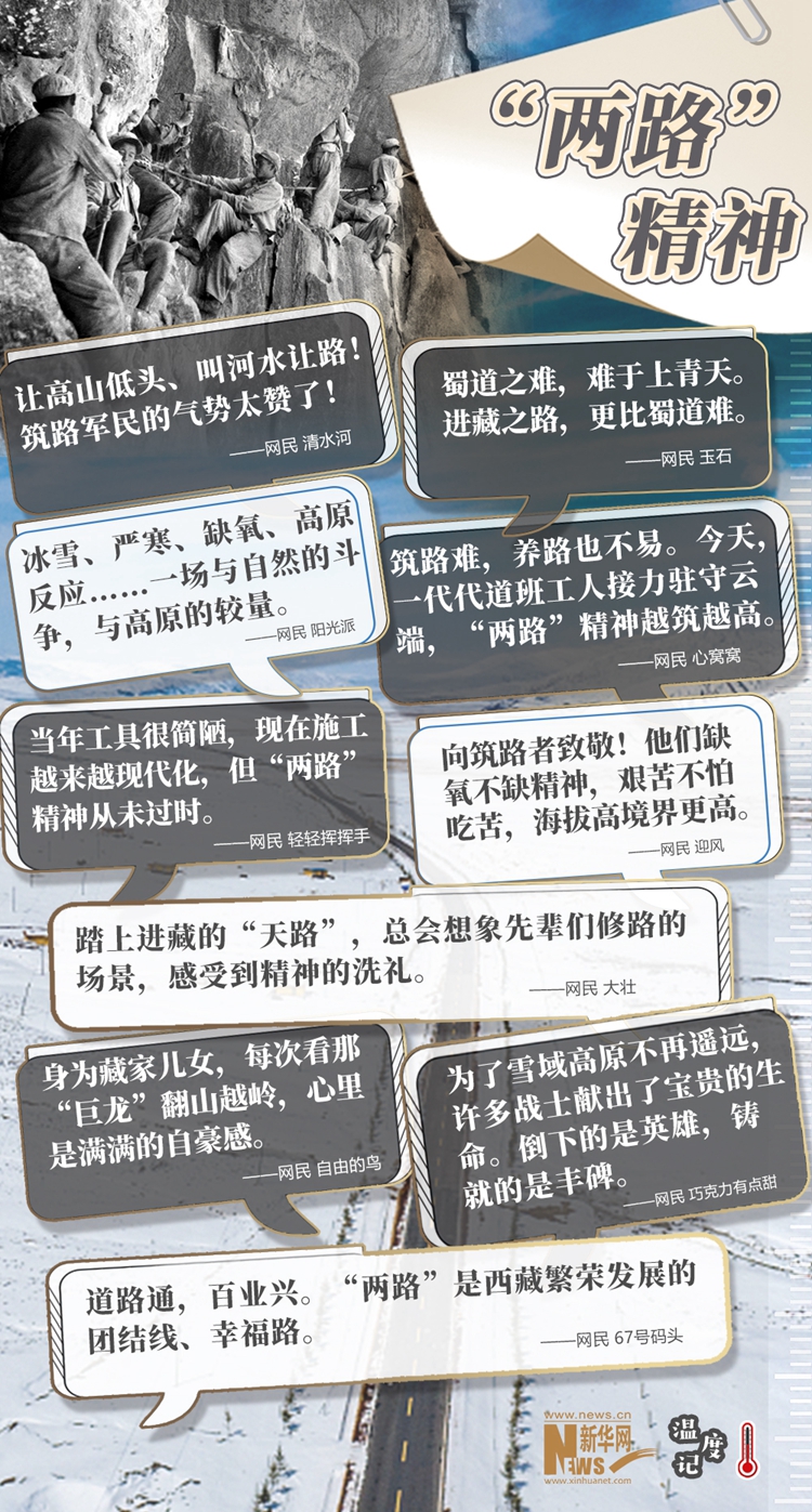 “天路”巍峨,精神閃光。當雪域高原換了人間,新一代建設者正接過接力棒,在新時代續(xù)寫著新的傳奇?!敖裉?,一代代道班工人接力駐守云端,‘兩路’精神越筑越高”,正如網(wǎng)民所說,無論過去、現(xiàn)在和將來,“兩路”精神都是西藏各族人民建設幸福家園的力量源泉和精神動力,也必將激勵中華兒女為了更加美好的明天繼續(xù)奮斗、前行。(文字:馬若虎 海報設計:王曄)