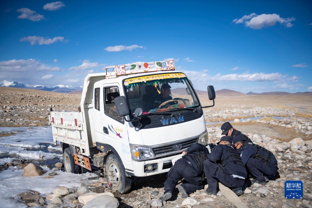 普瑪江塘邊境派出所的移民管理警察們幫助牧民旦增多杰的小貨車從冰河脫困(11月20日攝)。新華社記者 孫瑞博 攝
