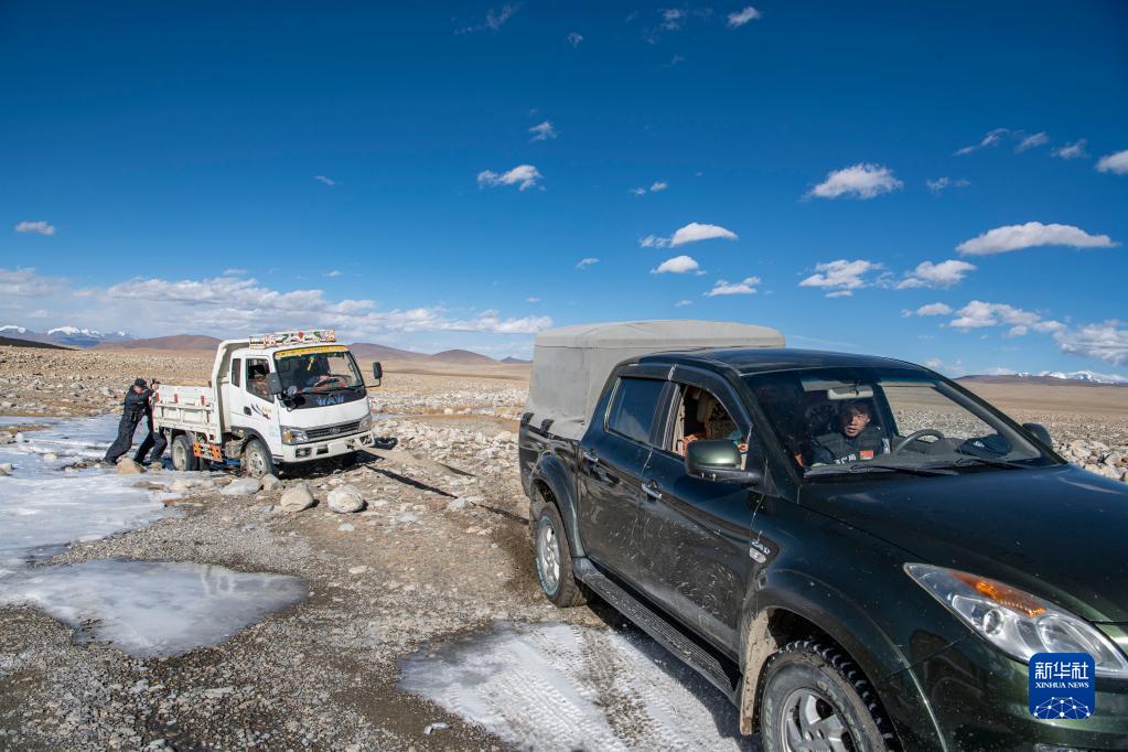 普瑪江塘邊境派出所的移民管理警察幫助牧民旦增多杰的家人離開困在冰河里的小貨車(11月20日攝)。新華社記者 孫瑞博 攝
