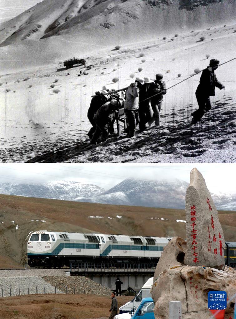 拼版照片:上圖為20世紀50年代拍攝的勘測青藏線的資料照片;下圖為2006年7月1日,青藏鐵路全線通車。這是從格爾木出發(fā)的“青1”次列車經(jīng)過海拔4767米的昆侖山口(新華社記者侯德強攝)。新華社發(fā)
