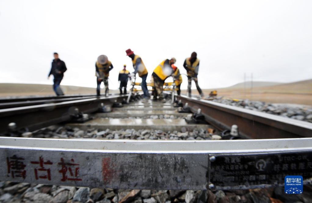 2018年6月30日,在青藏鐵路唐古拉站附近,養(yǎng)路工人冒雨對路軌進行搗固作業(yè)。新華社記者 侯德強 攝