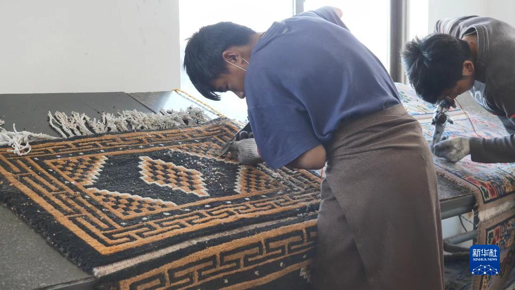 江孜昵煒藏毯廠工人正在對卡墊進(jìn)行修剪。(2021年10月29日)新華社記者洛卓加措 攝