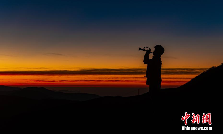 2022年1月1日,西藏軍區(qū)某旅駐守在海拔4600米的邊防執(zhí)勤點(diǎn)的任務(wù)分隊(duì)官兵,在邊關(guān)戰(zhàn)位上迎來了新年的第一縷陽光。新年第一天,分隊(duì)官兵踏上天險(xiǎn)巡邏路,趟冰河,翻峭壁,鉆叢林,巡邏行程超過30公里,海拔落差近千米。圖為黎明時(shí)分,新年的第一次號(hào)聲。 西藏軍區(qū)某旅 供圖