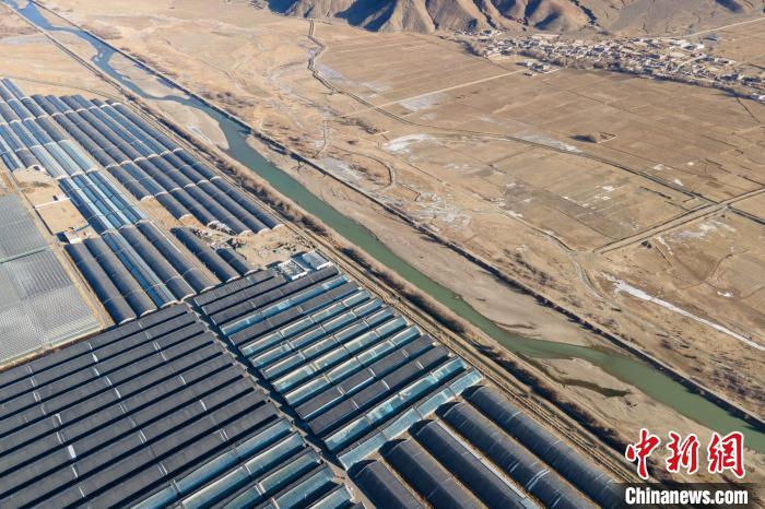 圖為1月28日上午,航拍西藏日喀則珠峰現(xiàn)代農業(yè)科技創(chuàng)新博覽園蔬菜大棚。江飛波 攝