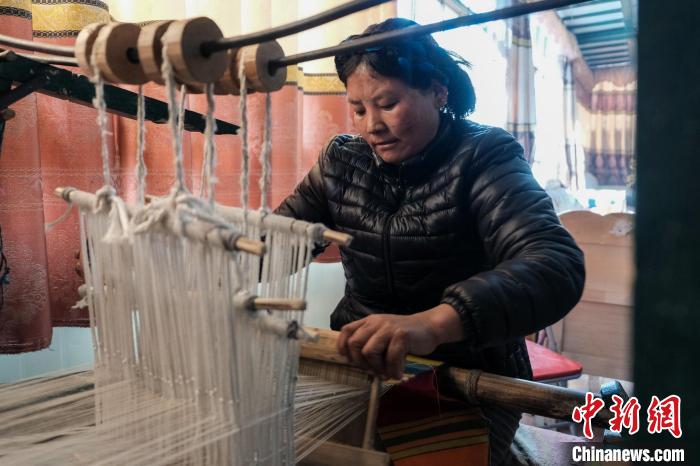 在他們家,記者看到了幾臺(tái)傳統(tǒng)藏式織機(jī),玉珍說(shuō),這是用于織邦典(藏式毛織圍裙)的工具。2016年開(kāi)始,玉珍運(yùn)用編織技藝帶領(lǐng)村里的婦女共同成立了一個(gè)小規(guī)模的編織廠,“我們的羊毛線是自己染的,織出來(lái)的邦典質(zhì)感更好,也不愁銷路,為家里增收不少?!彼f(shuō),編織讓大家實(shí)現(xiàn)了家門口就業(yè),也不耽誤家務(wù),村里人很樂(lè)于接受。