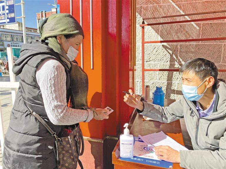 八廓商城市場部部長卓嘎介紹說:“為廣大市民提供一個(gè)安全、祥和的購物環(huán)境,我們?cè)谏虉鲈O(shè)有5個(gè)進(jìn)出口,每個(gè)進(jìn)出口都需掃行程碼、測(cè)量體溫后才可進(jìn)入。因?yàn)橛行├先藳]有智能手機(jī),無法掃健康瑪,我們會(huì)登記姓名、身份證號(hào)、聯(lián)系方式。并且在增加的攤位旁增設(shè)消防器材,不定時(shí)巡邏?!?/p>