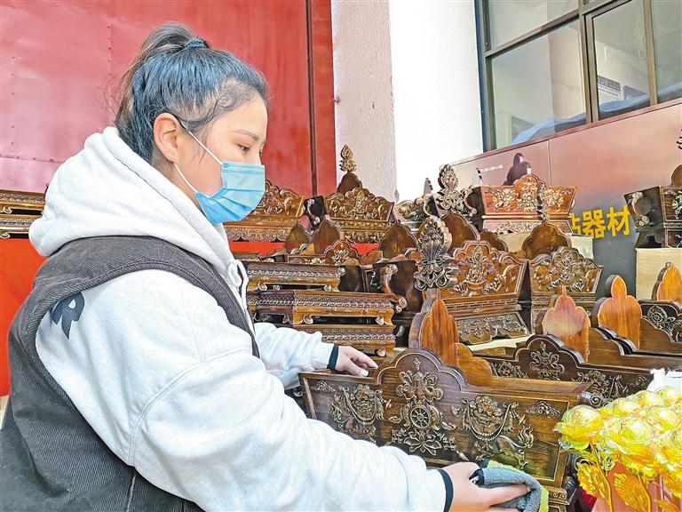 來自山南市貢嘎縣的拉吉帶著自家生產(chǎn)的“切瑪盒”第2次來到八廓商城年貨市場?!坝捎谑亲约疑a(chǎn),所以我們自主設(shè)計(jì)了一款線條稍微簡約的‘切瑪盒’;還有一款傳統(tǒng)線條與圖案的‘切瑪盒’。在顏色上,我們選擇了較為持重的深色,這樣的顏色大氣沉穩(wěn),許多市民非常喜歡,兩款售價(jià)都是380元。”拉吉介紹道。