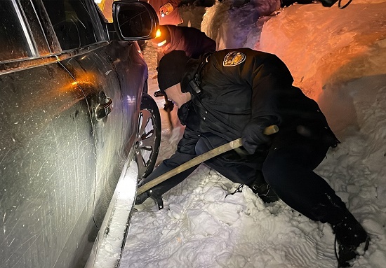 在到達(dá)現(xiàn)場后,救援民警立即為早已凍得瑟瑟發(fā)抖的被困人員送上了熱水和防寒大衣,并安撫了被困人員情緒。在勘察了現(xiàn)場的情況后,救援民警一邊用鐵鍬和雙手迅速清理車輛底盤的厚冰,一邊用牽引繩嘗試將被困車輛進(jìn)行拉出,因積雪太厚嘗試多次未能成功,隨后,協(xié)調(diào)到朗縣養(yǎng)護(hù)段一輛推土機(jī),經(jīng)過一個小時救援,被困車輛成功被拖出。被困人員救出來后,為了確保車輛人員的絕對安全,金東邊境派出所救援民警全力護(hù)送被困人員于晚上11點45分安全抵達(dá)單位營區(qū),救援工作取得圓滿成功。