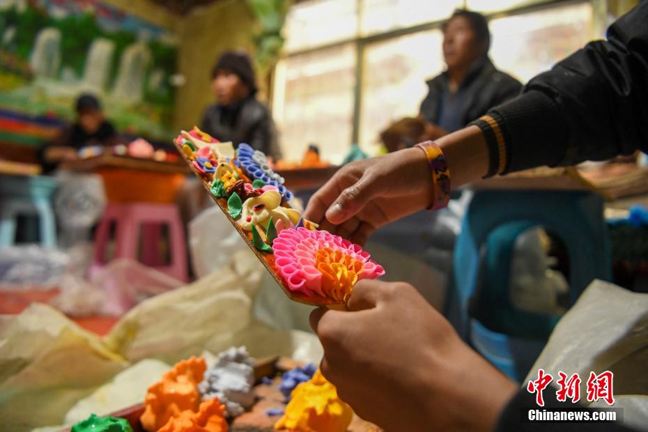 酥油花是古代藏傳佛教信眾因冬季沒有鮮花供佛而發(fā)明的替代品,如今已演變成藏歷新年年貨。貢嘎來松 攝