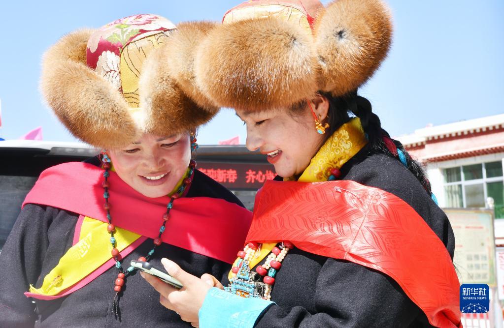 3月3日,西藏山南市貢嘎縣崗堆鎮(zhèn)群眾通過智能手機(jī)向外地的朋友拜年。新華社記者 覺果 攝