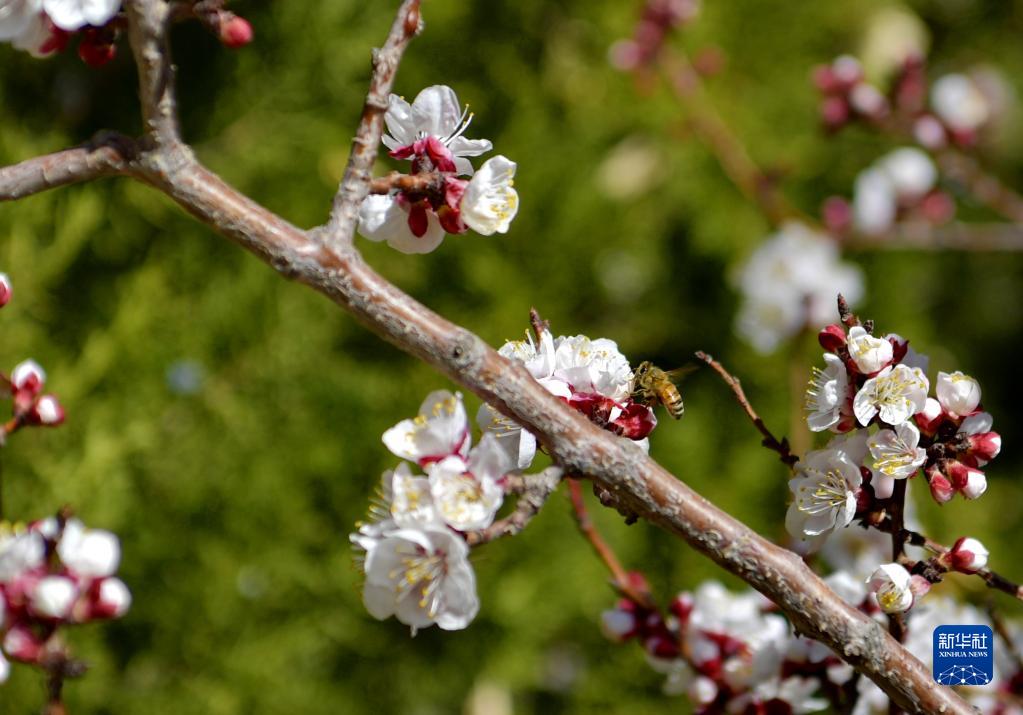 蜜蜂在拉魯濕地旁的杏花間飛舞(3月20日攝)。新華社記者 張汝鋒 攝
