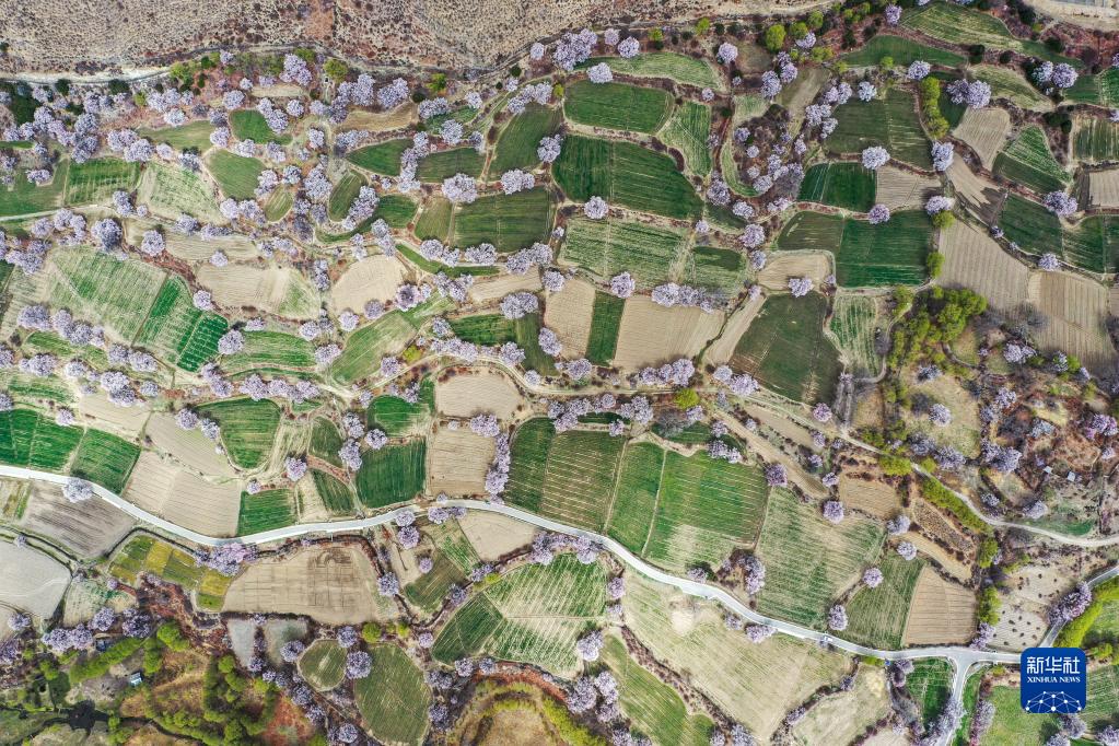 西藏林芝市巴宜區(qū)布久鄉(xiāng)朵當(dāng)村桃花園(3月28日攝,無(wú)人機(jī)照片)。新華社記者 洛卓嘉措 攝