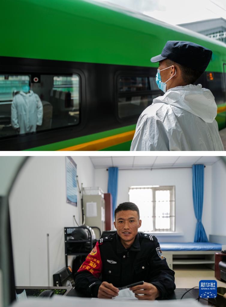 拼版照片:上圖為3月31日,白瑪旺扎在列車即將駛離車站時(shí)執(zhí)勤(新華社記者洛卓嘉措攝);下圖為白瑪旺扎在派出所接待窗口(新華社記者劉潁攝)。今年24歲的白瑪旺扎2021年8月起在林芝站派出所擔(dān)任輔警,他的家位于離車站3公里的麥巴村。鐵路的開(kāi)通讓他解決了就業(yè),同時(shí)還能照顧家庭。新華社發(fā)