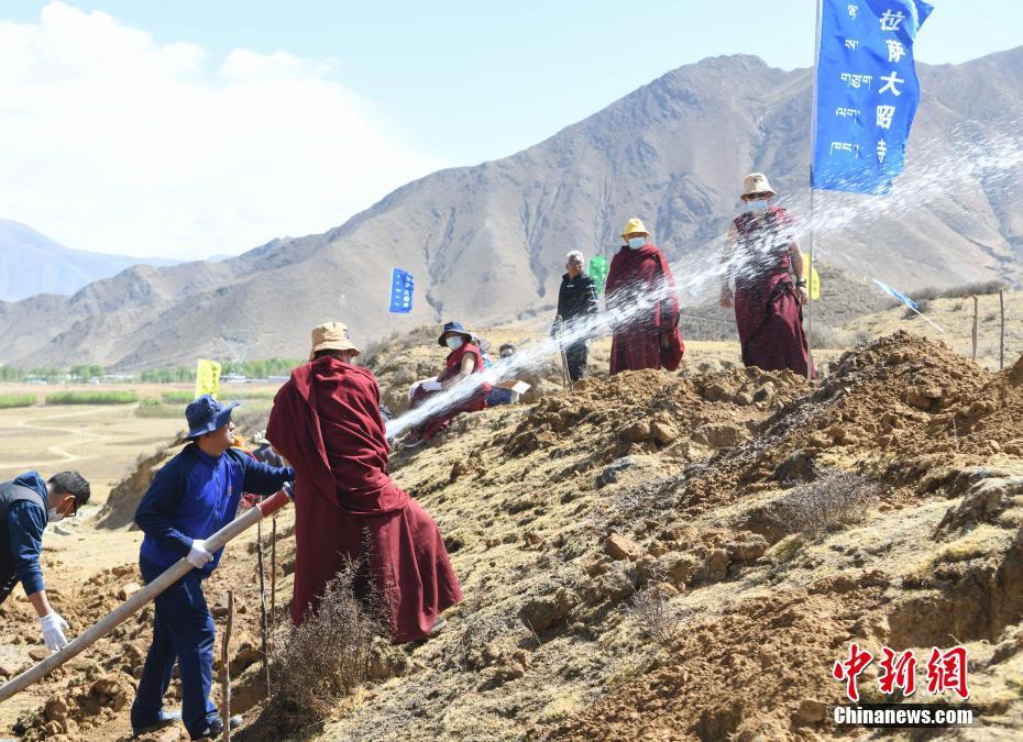 4月15日,西藏大昭寺僧人等在蔡公堂鄉(xiāng)植樹。當(dāng)日,西藏大昭寺在拉薩市城關(guān)區(qū)蔡公堂鄉(xiāng)啟動(dòng)拉薩南北山2800余畝山地綠化工程項(xiàng)目。 中新社記者 貢嘎來松 攝