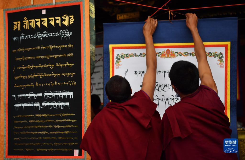 4月28日,拉薩大昭寺僧人在布展。新華社記者 覺(jué)果 攝
