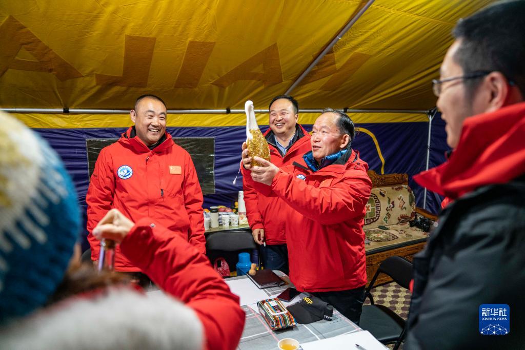 浮空艇創(chuàng)造紀(jì)錄后,科考隊(duì)員開香檳慶祝(5月15日 攝)。新華社記者 孫非 攝