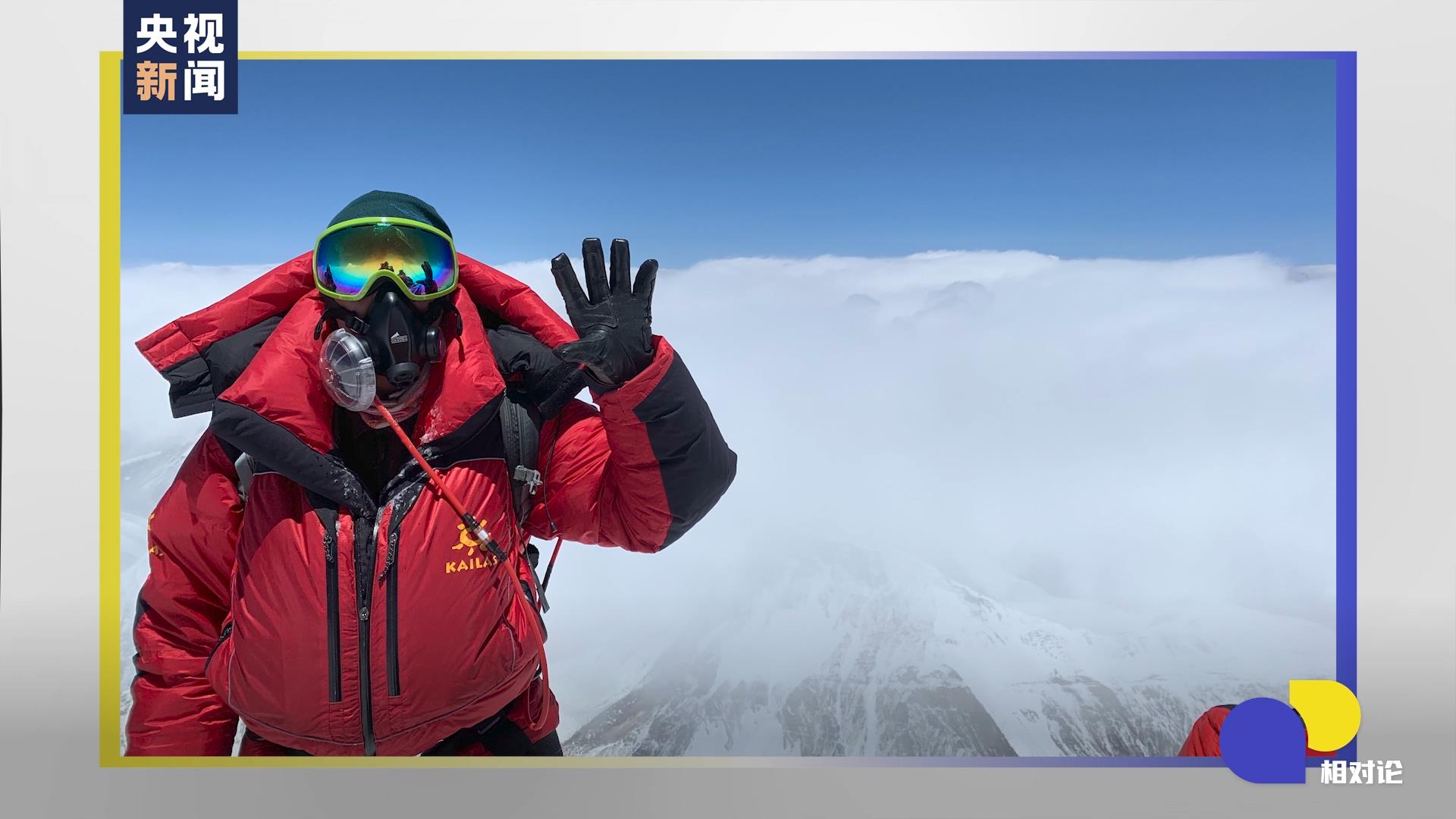 5月4日登頂、完成科考任務(wù)后,德慶歐珠左手比了一個(gè)“五”,這是他的第五次登頂。
