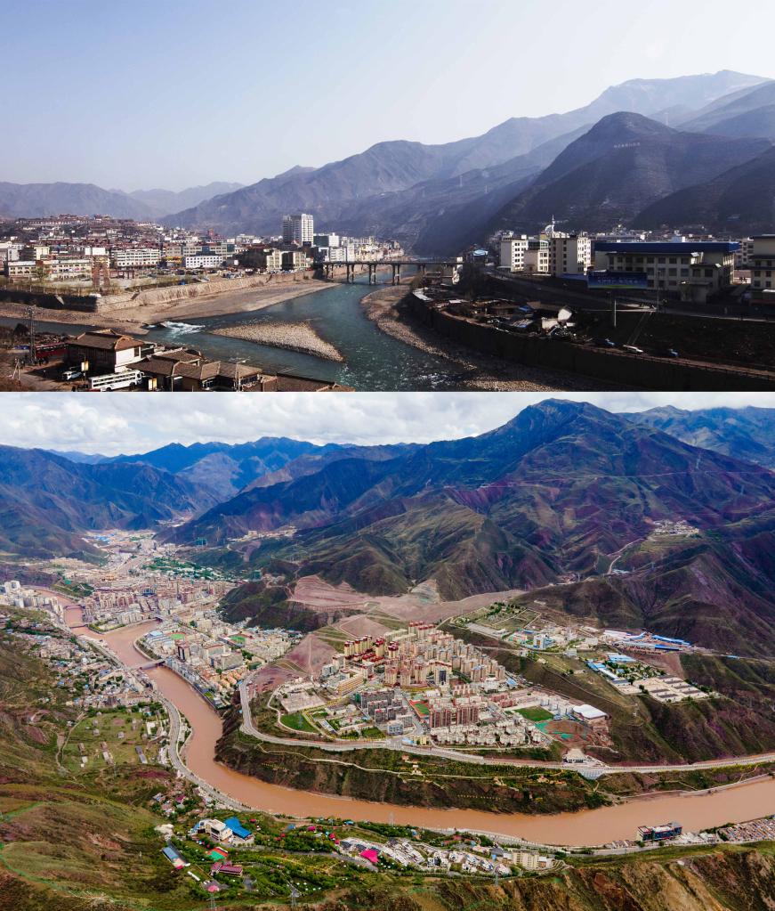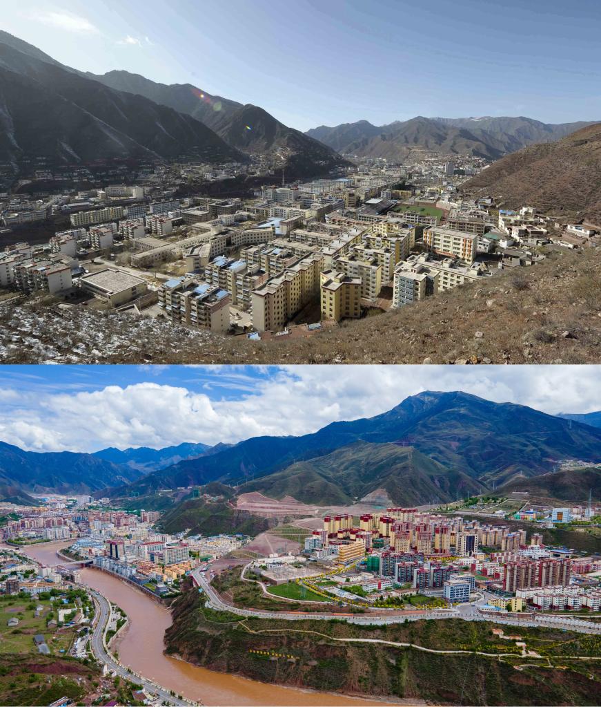 拼版照片:上圖是2009年3月15日拍攝的昌都(新華社記者 普布扎西 攝);下圖是2022年5月22日拍攝的昌都市卡若區(qū)(新華社記者 周荻瀟 攝,無(wú)人機(jī)照片)。新華社發(fā)