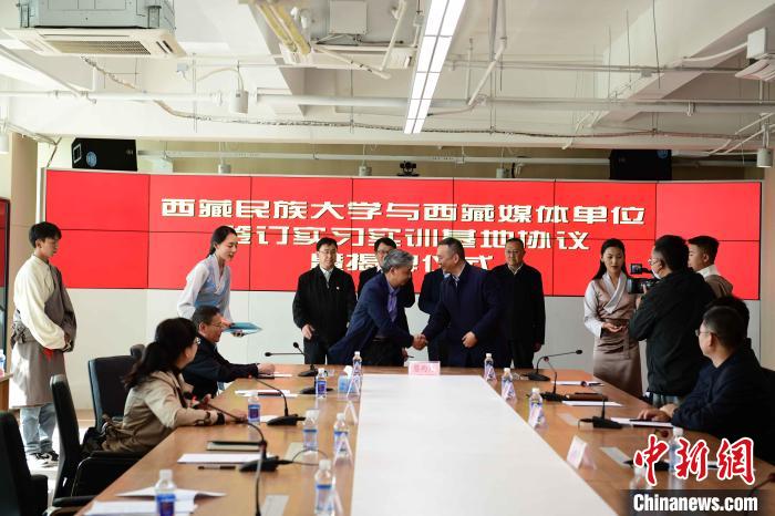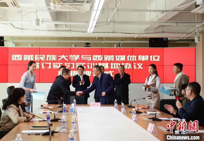 5月27日,西藏民族大學(xué)與西藏日報社、西藏廣播電視臺、人民網(wǎng)西藏頻道、中國新聞社西藏分社、中國西藏網(wǎng)西藏記者站等媒體單位簽訂實習(xí)實訓(xùn)基地協(xié)議暨揭牌儀式在西藏日報舉行。