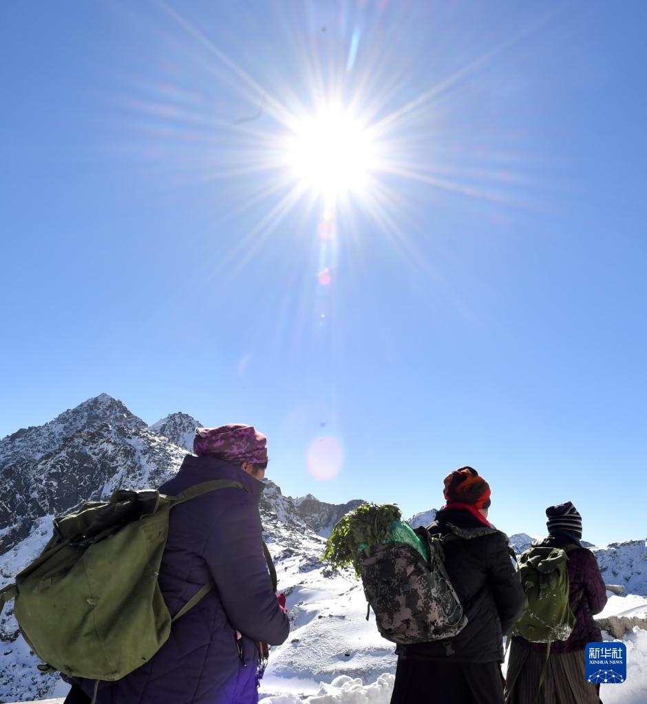 西藏亞?wèn)|縣仁青崗村的達(dá)吉、次仁曲珍和普赤三位藏族老阿媽在前往詹娘舍哨所送菜的路上(2022年1月27日攝)。新華社記者 覺(jué)果 攝