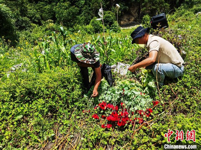 圖為民警鏟除野生罌粟現(xiàn)場?!∪湛t市公安局禁毒支隊供圖