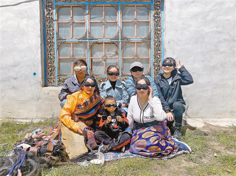 圖為次仁曲吉(左一)家中,次仁曲吉及其家人與記者一行佩戴上“安多眼罩”合照留念。萬靖 高玉潔 攝