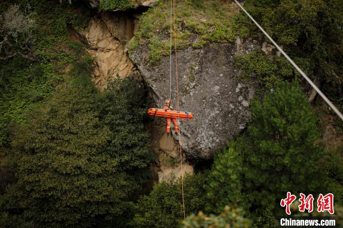 根據(jù)行動(dòng)預(yù)案,模擬游客因腿部受傷跌落谷底。接到求助后,消防救援人員迅速集結(jié)出動(dòng),前往事發(fā)地域。因山谷內(nèi)林木茂密、遮蔽視線,救援人員采取垂直下降技術(shù)在崖壁和谷底進(jìn)行搜索定位。