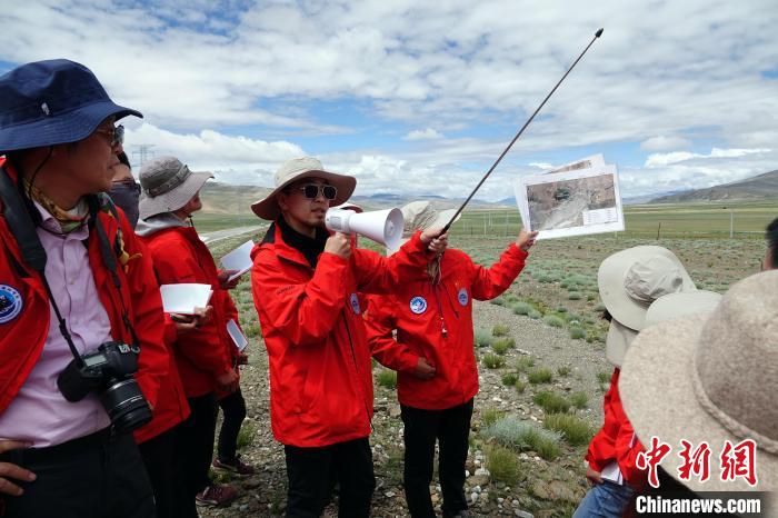 科考隊(duì)員、中國科學(xué)院青藏高原研究所張帥博士在古湖底分析講解瑪不錯(cuò)和嘎拉錯(cuò)劇變之謎。中新社記者 孫自法 攝