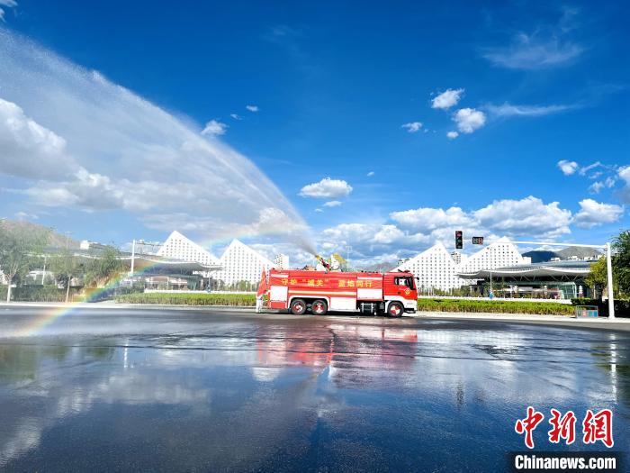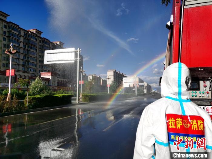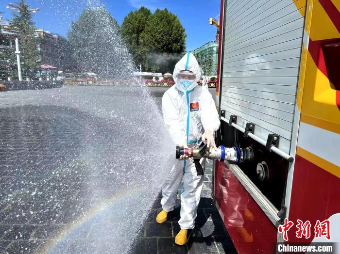 圖為拉薩消防指戰(zhàn)員在主城區(qū)街道進(jìn)行消殺。 拉薩市消防救援支隊(duì) 攝