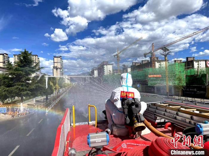 圖為拉薩消防指戰(zhàn)員在主城區(qū)街道進(jìn)行消殺?!±_市消防救援支隊(duì) 攝