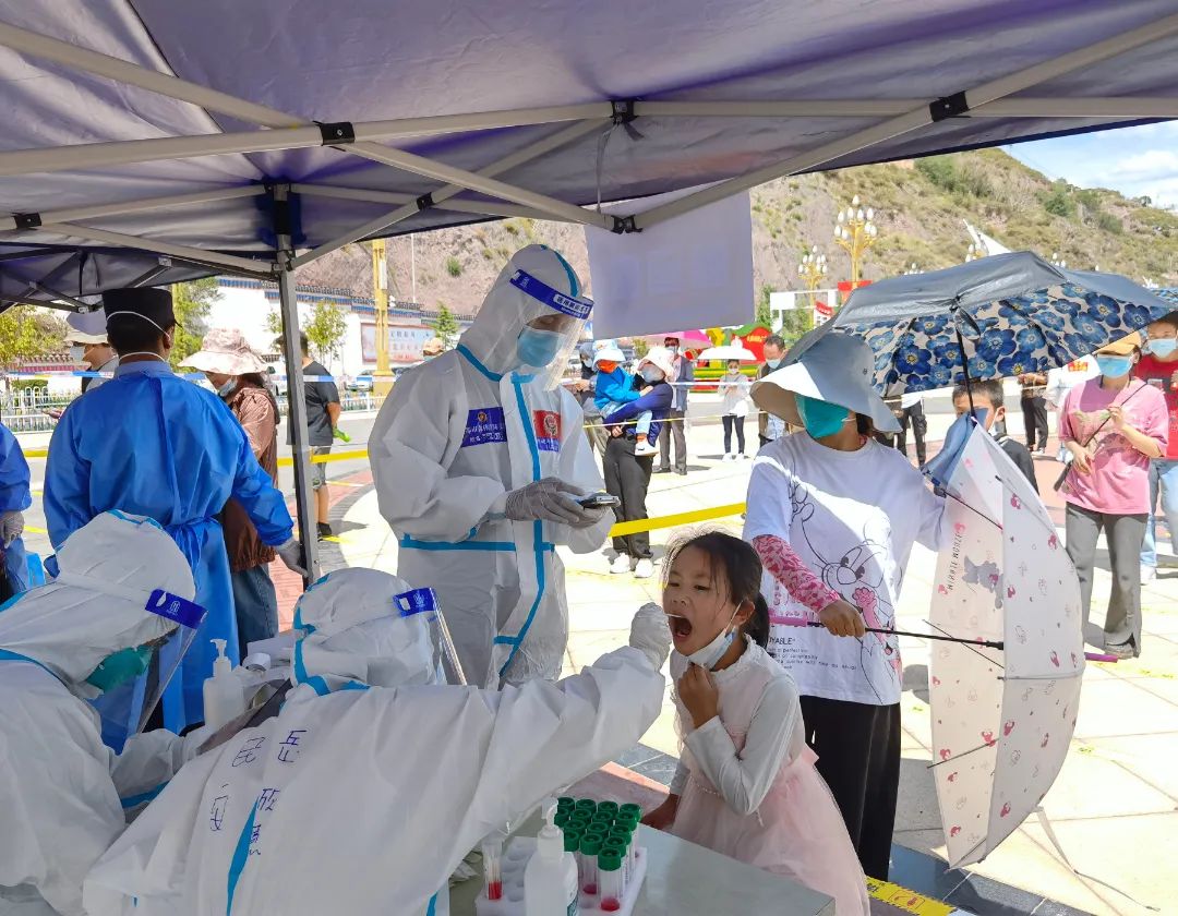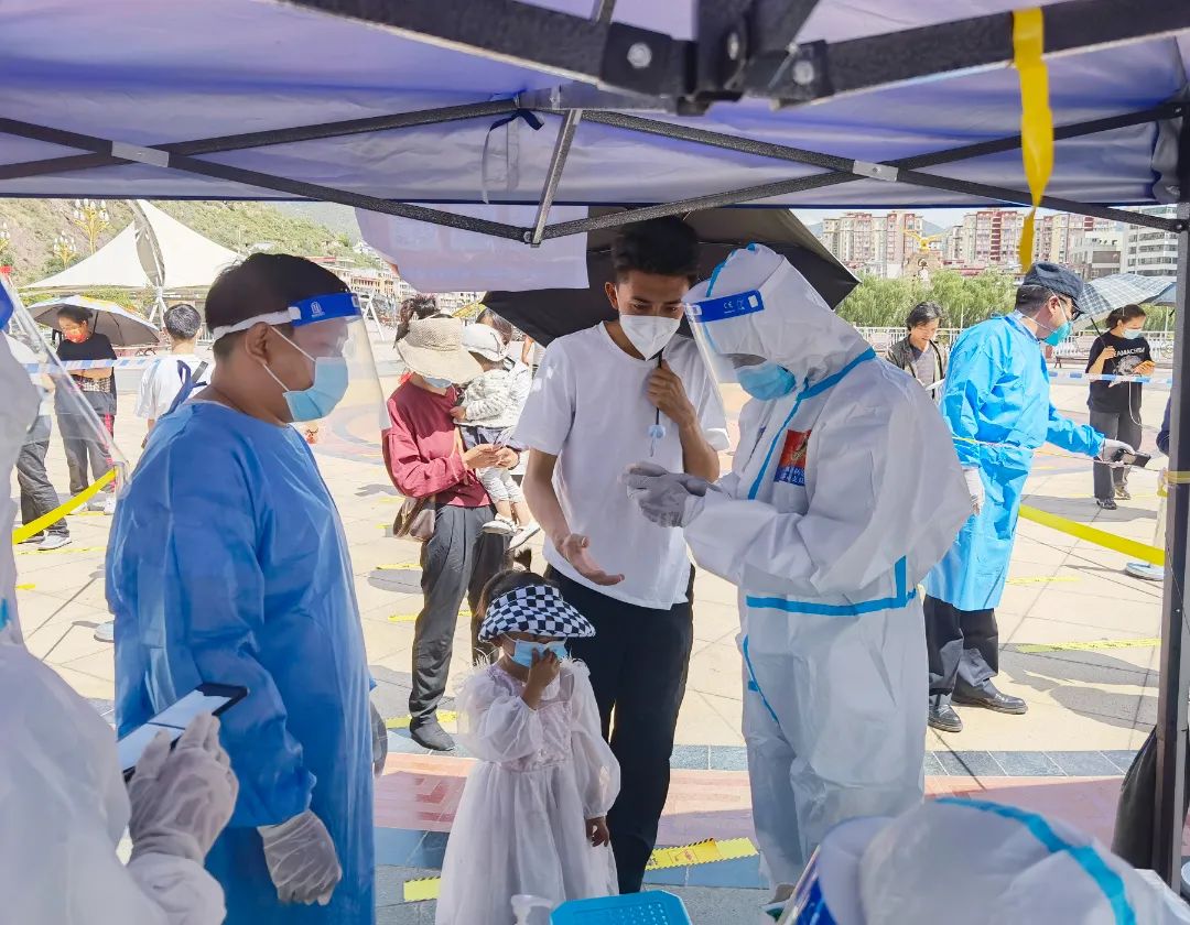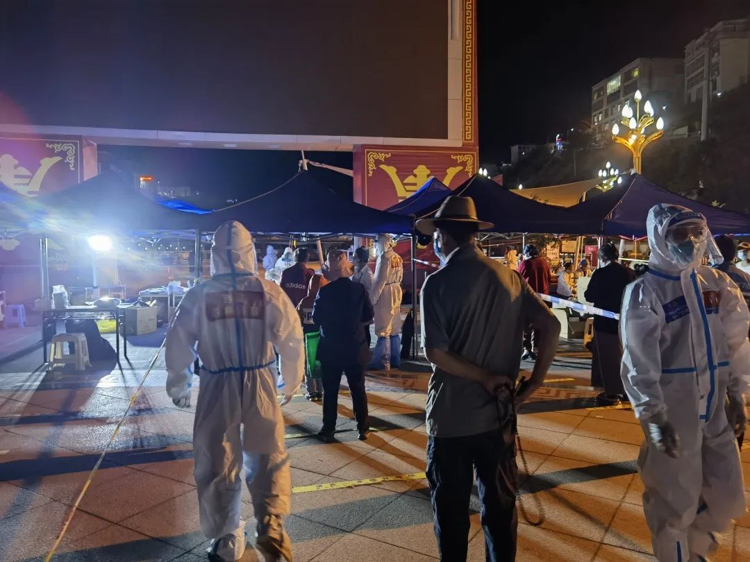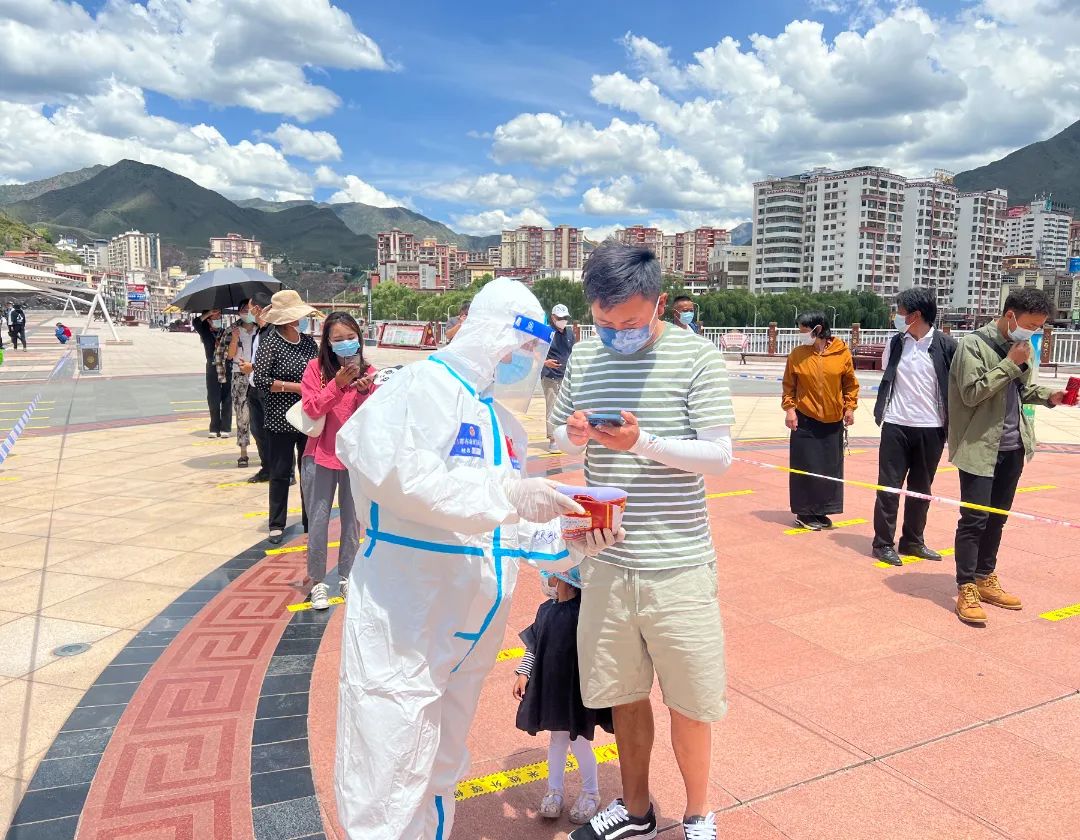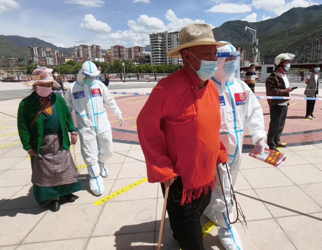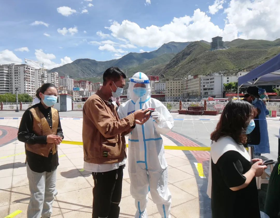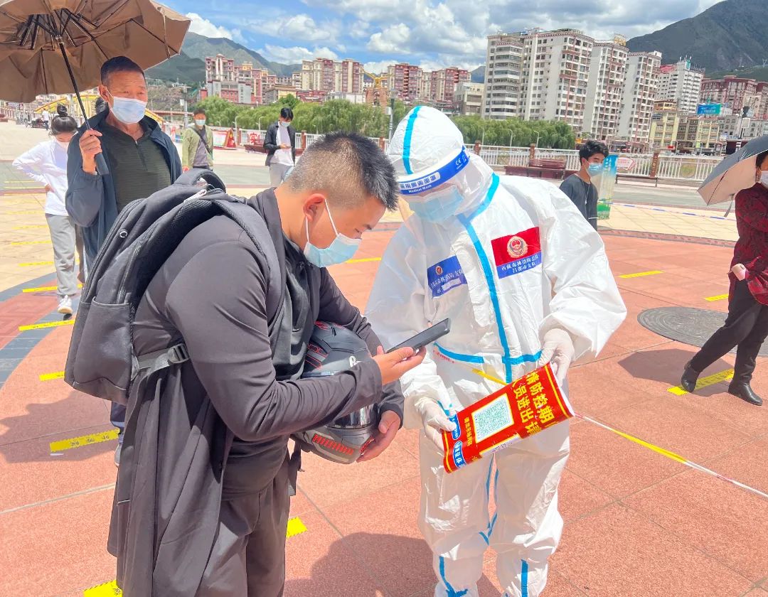 “為了您的安全,請保持1米以上間隔,謝謝?!蓖砩?點多,在茶馬廣場,支隊三級消防士張興梁,依然堅守在抗疫一線,維持著排隊做核酸的長隊。從早上7點開始,張興梁和其他消防隊員已堅守了14個多小時。“西藏晝夜溫差特大,白天防護服里面衣服都濕透了,但是到晚上這個點已經(jīng)干了,正好不用換衣服了?!睆埮d梁打趣的說到。