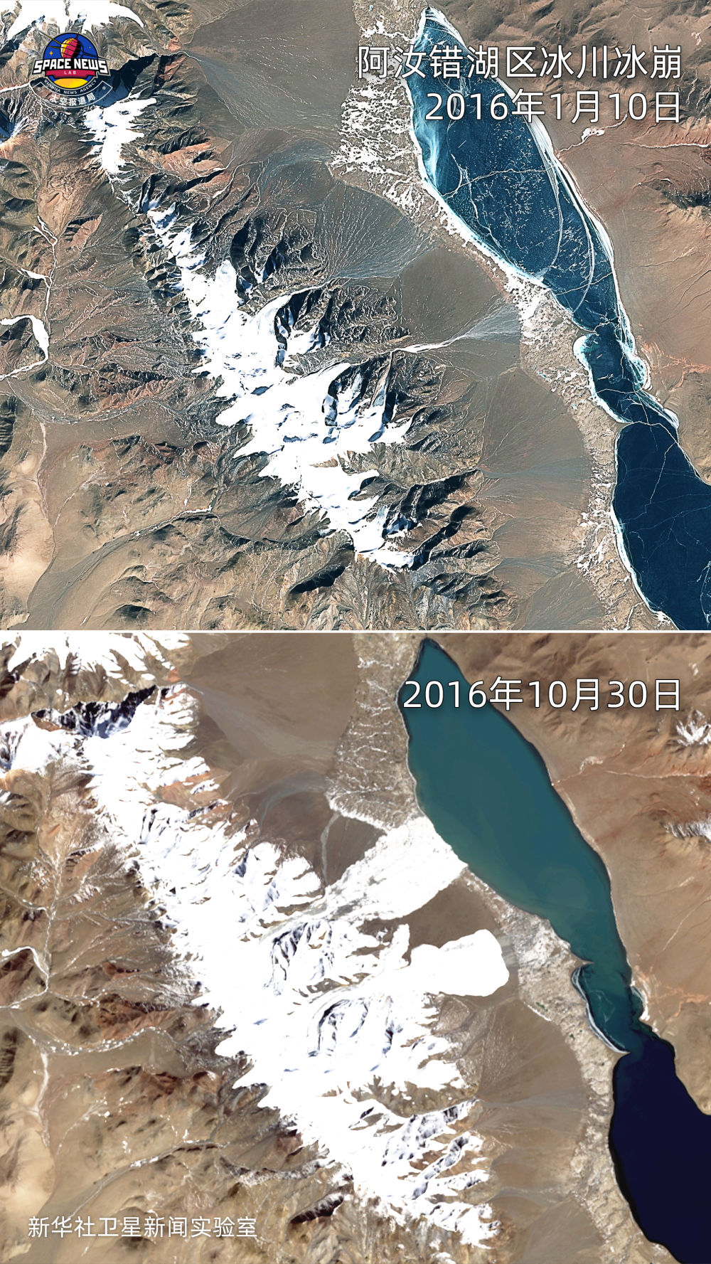 西藏阿里阿汝錯湖區(qū),2016年7月和9月先后發(fā)生兩次大型冰崩災害,冰崩體攜帶大量碎屑物質,滑動約8公里后沖入阿汝錯,在湖岸留下兩個巨大的冰崩扇。