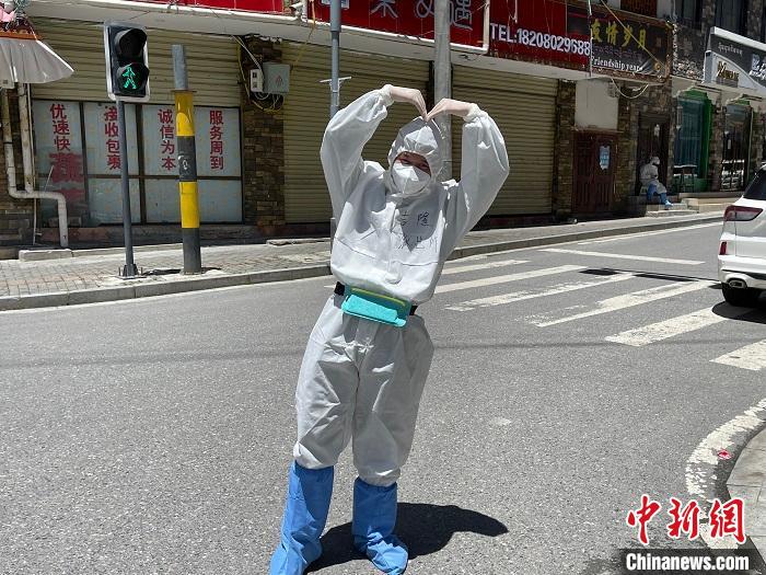 民警賀東在做好自身防護(hù)的前提下不停巡邏排查,一轉(zhuǎn)就是8個小時。他為民眾、游客及工人聯(lián)系購買生活物資、煤氣等。汗水浸濕在口罩里,不到一會,“大白”就能“喝”到自己的汗水。