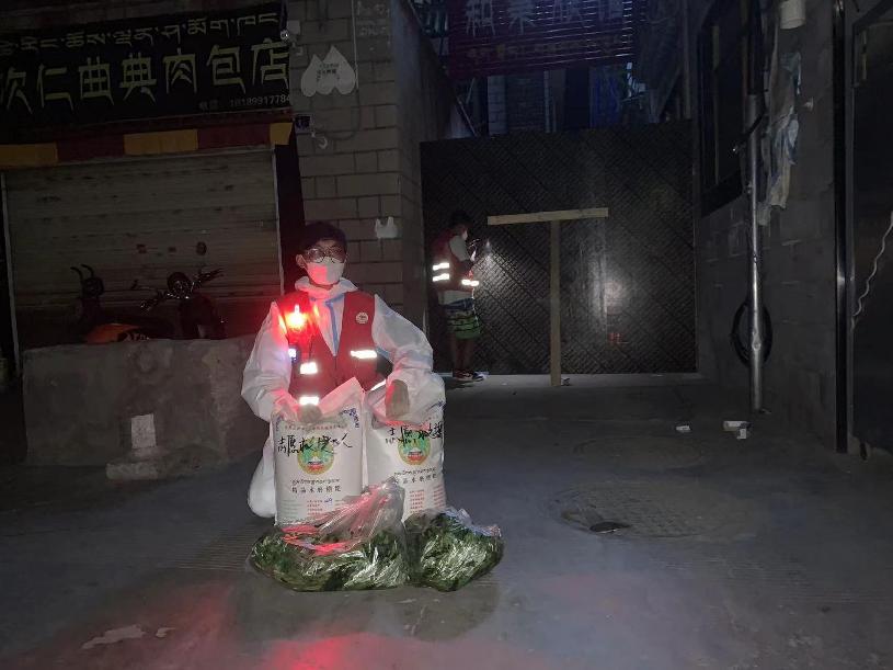 8月22日,正在嘎瑪貢桑志愿服務(wù)的救援隊(duì)隊(duì)員李正煒聯(lián)系社區(qū)工作人員,核實(shí)情況,了解這個(gè)家庭的需求后,副隊(duì)長(zhǎng)朱奕霖采購(gòu)物資,晚上隊(duì)長(zhǎng)陳雷將嘉措居委會(huì)、八一社區(qū)、第十一安居苑等社區(qū)的捐贈(zèng)防疫物資配送完畢后,回到東郊,將糌粑、蔬菜等食品送往嘎瑪貢桑高風(fēng)險(xiǎn)區(qū),交到了救助家庭人員的手中。