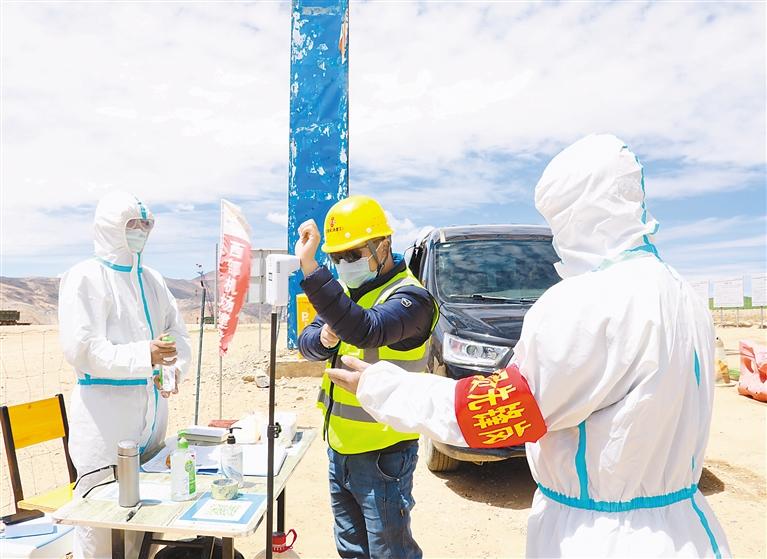 在西藏阿里普蘭機(jī)場項目施工現(xiàn)場,施工人員經(jīng)過體溫檢測、身份登記、消毒等程序后,才能進(jìn)入工地。施工現(xiàn)場機(jī)器轟鳴,管理人員分兵把口,施工人員各司其職,整個工地處處都是忙碌的身影。