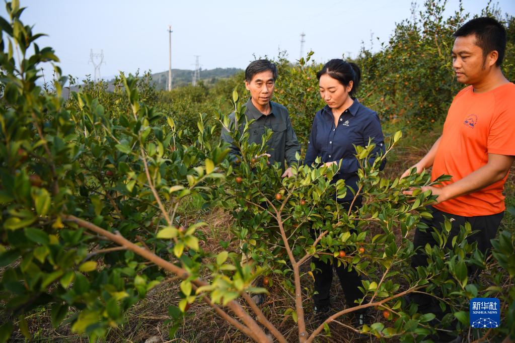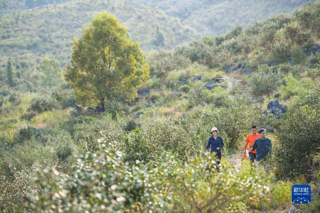 9月21日,在廣東韶關(guān)樂昌市梅花鎮(zhèn)流山村,白拉曲珍(左)和師傅江建發(fā)(右)、同事伍國清來到石漠化綜合治理的油茶種植基地查看油茶生長情況。新華社記者 鄧華 攝