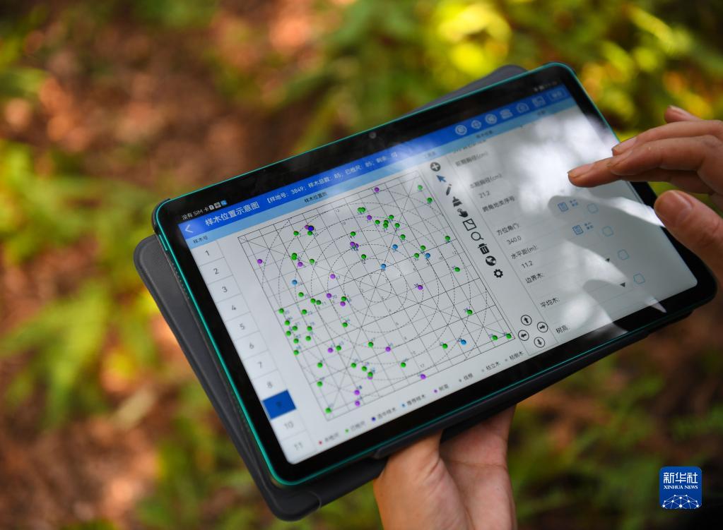 9月22日,在廣東韶關(guān)樂昌市張溪村的生態(tài)監(jiān)測樣地,白拉曲珍查看軟件數(shù)據(jù)。新華社記者 鄧華 攝