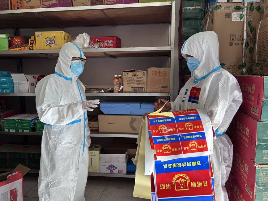 圖為日喀則支隊后勤管理員李萬樂(右一)與醫(yī)療、生活物資保供單位聯(lián)系,調(diào)集防疫物資。