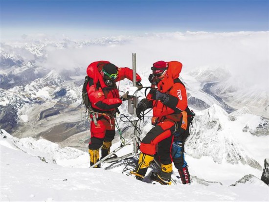 配合開(kāi)展國(guó)家第二次青藏高原綜合科學(xué)考察研究,助推西藏自治區(qū)加快建設(shè)生態(tài)文明高地。圖為2022年5月4日,珠峰科考登頂隊(duì)員在珠穆朗瑪峰海拔8830米處成功架設(shè)全球海拔最高的自動(dòng)氣象站。